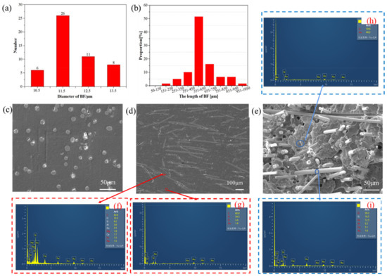 The structural characterizations of the PLA-based binary and ternary blends: (a) diameters from 10.5–13.5 μm, (b) length of the BF, (c) the surface SEM micrographs of C2, and (d) the cross-sectional SEM micrograph of C2. (f,g) are the EDS from the SEM micrograph of (d), (e) is the tensile fracture morphology of C2, (h,i) are the EDS from the SEM micrograph of (e).