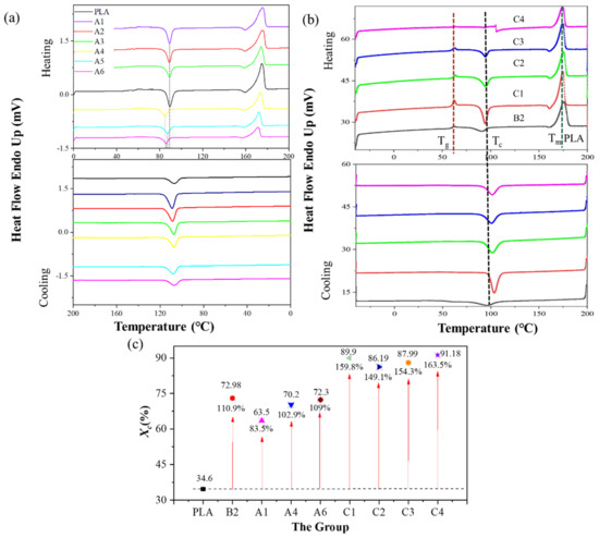 The thermal behavior of the polymers: (a) the DSC curves of group A, (b) the DSC curves of group C, and (c) Xc (percent).