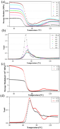 The mechanical properties of the polymers with a focus on the thermal endurance properties: (a) the storage modulus and (b) tanδ curves of group A, and (c) the storage modulus and (d) tanδ curves of C2 and C4.