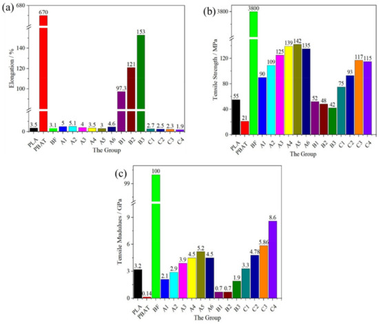 The tensile properties of the polymers (Figure 6) indicate the effect of adding BF and the mesophase PBAT into the PLA matrix. The elongation at break (Figure 6a), tensile strength (Figure 6b), and tensile modulus (Figure 6c) indicate that compared with PLA, regarding polymers of groups A and C, the tensile modulus and tensile strength of group B decreased because PBAT improved the tenacity of PLA, whereas the elongation at break was not substantially improved. The tensile strength of the polymers gradually increased with the content of BF, and it should be noted that the tensile strength of group A was higher than that of group C at the same BF content, and the tensile strength of the polymers gradually increased with an increasing content of BF. Conversely, the tensile modulus increased from 3.2 GPa (PLA) to 8.6 GPa (C4), and the tensile modulus of C4 was 168.8% higher than PLA. These indicate that BF played an important role in enhancing the tensile properties of PLA.