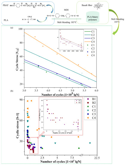 - The tensile tests indicated that the tensile strength of the polymers gradually increased in accordance with the content of BF, thus BF played an important role in enhancing the properties of PLA. The tension–tension fatigue tests indicated that the triblock copolymers could exhibit an improved fatigue life; the fatigue lives of B1 and B2 were much lower than that of group C. C4 exhibited synergistic mechanical properties with high extensibility based on the comprehensive analyses of the tensile tests, fatigue tests, and the failure mechanism.