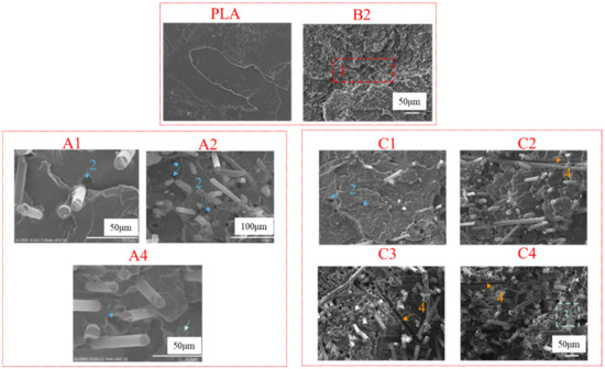 The impact tensile fracture surface of PLA, groups A, B, and C can be seen in Figure 8, and the phenomenon of area 1 in Figure 8 is craze, area 2 is fiber pull-out, area 3 is fiber fracture, and area 4 is fiber debonding. Figure 8 indicates a brittle morphology of PLA, and a toughness one for B2; craze and additional roughness were found in B2. A1 was dominated by craze, fiber pull-out, and fiber fracture. A2 had fiber pull-out as the main failure morphology. A4 exhibited fiber fracture and fiber pull-out. C1 was dominated by craze and fiber pull-out, and the fiber fracture occurred locally. The morphology of C2 exhibited fiber pull-out, craze, and fiber debonding. The tensile fracture of C3 exhibited craze, fiber fracture, fiber pull-out, and local fiber debonding. The fracture morphology of C4 indicated fiber fracture, and there was good interfacial compatibility between the BF and matrix after tensile fracture.
