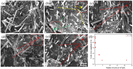 Figure 10 indicates the fracture morphology as determined by SEM and the fatigue point of C2. Figure 10a–e indicates the fracture morphology of C2 under the five aforementioned stress levels. The fracture morphology in Figure 10a,b was mainly fiber fracture and fiber pull-out; layered peeling was evident in Figure 10c–e. Figure 10f indicates the fatigue point of C2. The data dispersion of the five groups of fatigue test points was small and within the confidence interval, and the cyclic stress amplitude ([S-1]) of C2 was higher than that of C1 in Figure 9f, the same as the number of cycles (lgN).