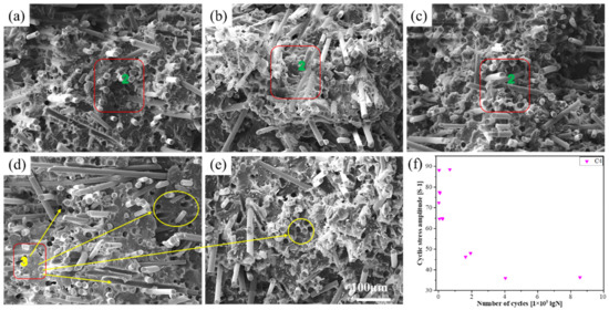 Figure 11 indicates the fracture morphology as determined by SEM and the fatigue point of C4. Figure 11a,b indicates the fracture morphology of C4 under the five aforementioned stress levels. The fracture morphology in Figure 11a–c was mainly fiber fracture, whereas that in Figure 11d,e was mainly fiber fracture and fiber pull-out.