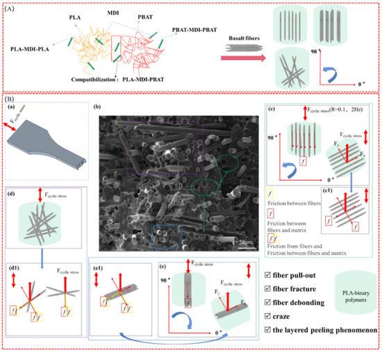 The polymerization schemes and fatigue failure mechanism of the polymers. (A) Polymerization schemes, (B) Fatigue failure mechanism: (a) scheme of the fatigue test; (b) fracture morphology of the PLA ternary polymers, with the phenomenon of fiber pull-out, fiber fracture, fiber debonding, craze and the layered peeling; (c–e) are the force status between BF and the matrix; c1–e1 are the microscopic stress decomposition diagrams corresponding to (c–e).