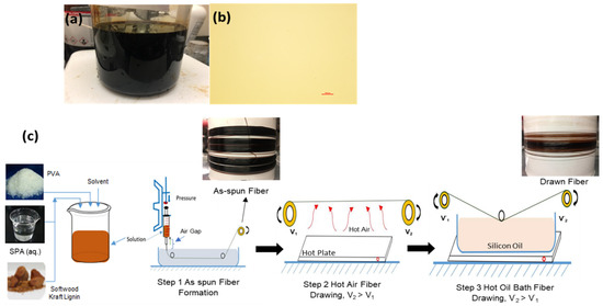 The homogeneity of lignin/PVA dopes is visible within (a) digital photograph and (b) optical micrograph of Lig5/PVA5 dope; (c) schematic for the dry-jet gel-spinning of Lig5/PVA5 fibers shows three processing steps: as-spun fiber formation (Step 1), hot air fiber drawing (Step 2), and hot oil multi-stage fiber drawing (Step 3).