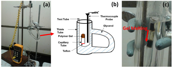 The thermoreversible nature of PVA gels returns them into liquids of dissolved polymer at elevated temperatures. The effects of lignin content and SPA on the gel melting temperature of thermoreversible gels were measured according to the method of Lu et al. [14]. Dopes were suctioned into the capillary tube (Figure 2b), keeping one end open and the other end capped with Teflon tape (Figure 2). The uncapped capillary end was placed in acetone at a low temperature until the dope gelled. Afterwards, the capillary tube was kept upside down in a test tube, alongside a thermocouple probe. The test tube was propped up in a Thiele tube filled with glycerol (as seen in Figure 2a,b). The flame of the Bunsen burner below the Thiele was used to gradually increase the oil temperature and to induce gel melting. Gel melting point was defined at the temperature where the gel starts to flow (Figure 2c).