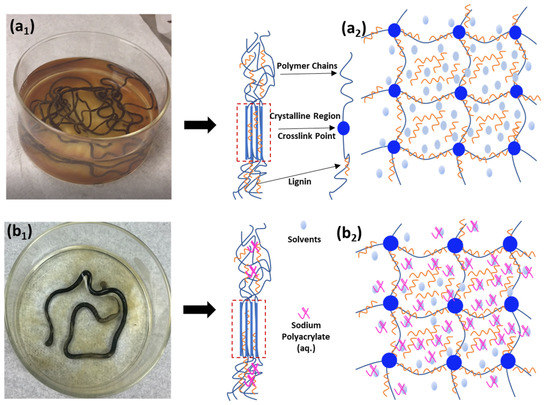 Figure 3 shows negligible amounts of lignin leached into the acetone from lignin/PVA gel fiber (at 50% lignin) containing SPA. But, lignin/PVA without SPA shows lignin diffusion into the acetone bath at low (30% lignin) to high (70% lignin) amounts of lignin (see Figure 3a having 50% lignin to PVA). Darkening of the solvent was indicative of lignin migration into acetone from the gel polymer. Lu et al. proposed gel structures of lignin/PVA fiber at low to high lignin loadings, wherein polymer dope transition into polymer-rich and solvent-rich domains upon gelation [13]. At higher lignin loadings, saturation of polymer-rich domains occurs, and lignin readily migrates into the methanol coagulation bath from solvent-rich domains [13]. The aqueous SPA might reside in solvent-rich domains which allows lignin to stay within as SPA precipitates in acetone. Therefore, the 100% acetone bath restricts lignin’s migration from both the polymer-rich and solvent-rich domains and into the coagulation bath. This results in higher lignin retention within the gel structure (Figure 3b).