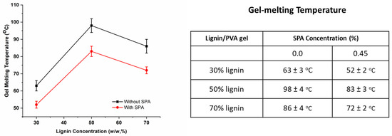 Gel-melting point of lignin/PVA with (red circles) and without (black squares) aqueous SPA.