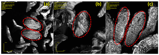Confocal micrographs of (a) Lig3/PVA7, (b) Lig5/PVA5, and (c) Lig7/PVA3 fibers.