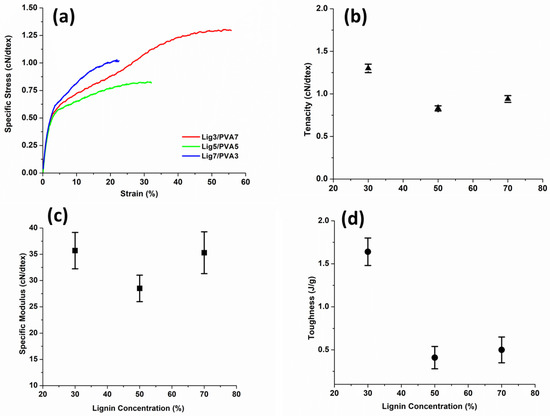 Tensile profile: (a) specific stress versus strain, (b) tenacity, (c) specific modulus, and (d) toughness of Lignin/PVA fibers at the dry condition.