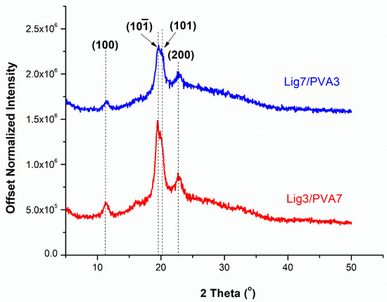 WAXD diffractograms of Lignin/PVA gel fibers.