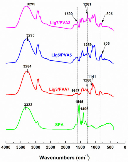 Intermolecular bonding between lignin and PVA induces molecular adhesion. The IR absorbance spectrum from 3000 to 3700 cm−1 (Figure 9) provides insight into hydrogen bonding for lignin and PVA. Table 3 describes the functional groups characteristic of PVA, lignin, and DMSO as detected by IR spectroscopy. Among lignin/PVA fibers, the absorbance peak of -OH shifted from 3304 cm−1 (see SI) for neat PVA to 3284 cm−1 for Lig3/PVA7 fiber (Figure 9). This implies hydrogen bonding between lignin and PVA [6,9,18]. At the highest lignin content (70%), the 3284 cm−1 peak shifted to 3318 cm−1 which suggesting less intermolecular interaction than Lig3/PVA7 fibers. Moreover, the -OH stretching vibration for pure PVA (at 3304 cm−1) gradually broadened and weakened, while the C-O stretching vibration at 1087 cm−1 increased. Strong peaks at 1261 cm−1 are indicative of C-O stretching in the guaiacylic rings, which are derived from the coniferyl lignin monomer found in both hardwood and softwood sources. Also, characteristic of lignin, strong peaks between 798–810 cm−1 are indicative of aromatic C-H stretching [1]. The characteristic peak for crystalline conformations of neat PVA (at 1141 cm−1) decreased as the lignin loadings keep increasing from 30–70% [18,19]. Amorphous PVA is associated with the C-O vibrational mode at 1087 cm−1 and PVA crystallinity affected 1141 cm−1 absorbance [18,20].
