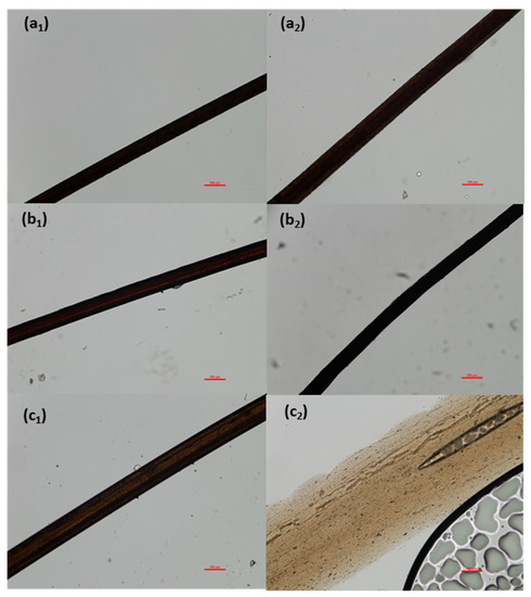 Optical Micrographs of (a) Lig3/PVA7, (b) Lig5/PVA5, and (c) Lig7/PVA3 fibers after immersion in water at (1) 25 °C and (2) 85 °C (100 µm scale bar).