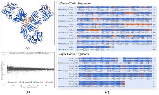 Trastuzumab modeling, resulting in: (a) 3D structure of trastuzumab, (b) comparison with non-redundant set of PDB structures, (c) heavy and light chain alignment.