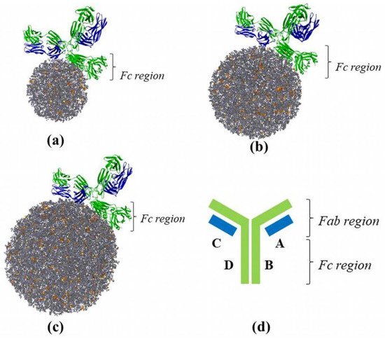 Combined particle-size variation conjugated to trastuzumab: (a) 50 Å, (b) 75 Å, (c) 100 Å, and (d) the regional structure of trastuzumab.