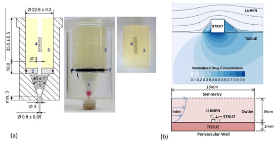 - Seidlitz, A.; Nagel, S.; Semmling, B.; Grabow, N.; Martin, H.; Senz, V.; Harder, C.; Sternberg, K.; Schmitz, K.-P.; Kroemer, H.K.; et al. Examination of drug release and distribution from drug-eluting stents with a vessel-simulating flow-through cell. Eur. J. Pharm. Biopharm. 2011, 78, 36–48. [Google Scholar] [CrossRef]
