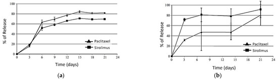 - Naseerali, C.P.; Hari, P.R.; Sreenivasan, K. The release kinetics of drug eluting stents containing sirolimus as coated drug: Role of release media. J. Chromatogr. B Anal. Technol. Biomed. Life Sci. 2010, 878, 709–712. [Google Scholar] [CrossRef]