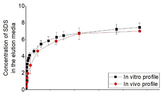 | 2% ultra-pure sodium dodecyl sulfate (SDS), in high purity water with 10% gradient-grade acetonitrile (ACN), and buffered to pH 4.5 with phosphate+ 55:45:0.02 water/tetrahydrofuran (THF)/formic acid (v/v) [56] | good correlate between in vitro release profile with in vivo from porcine | ||