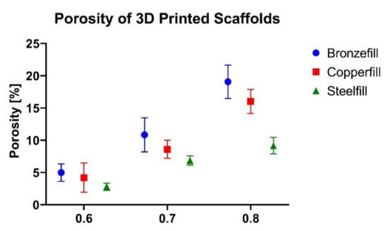 As shown in Figure 4, the higher the line spacing, the higher the porosity of the 3D printed scaffolds is. Among the different scaffolds, for a certain line spacing value, most porous scaffolds are the bronze-filled ones, followed by the copper-filled ones, although they were manufactured with the same 3D printing conditions: