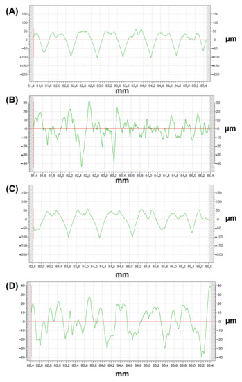 Roughness profiles of the steel-filled 3D printed samples. (A) 0.6 mm external roughness (first layer). (B) 0.6 mm internal roughness (second layer). (C) 0.7 mm external roughness (first layer). (D) 0.7 mm internal roughness (second layer).