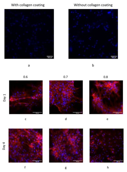 hBM-MSCs showed good adhesion to both collagen-coated and untreated 3D printed steel-filled PLA samples. Cells cultured for both 24 and 72 h were well-adhered to the 3D printed PLA composites (Figure 6a,b), with no observed differences between both conditions.