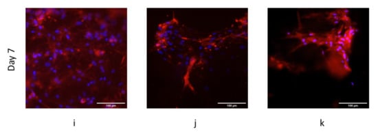 (a,b) Adhesion test to PLA with and without collagen coating. (c–e) Viability test at day 1 of cell culture. (f–h) Viability test at day 4 of cell culture. (i–k) Viability test at day 7 of cell culture.