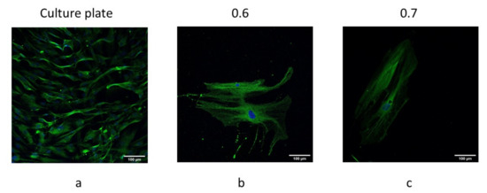 The images show the classical spindle-like shape of MSCs, so it seems that the steel-filled 3D printed structures are a suitable scaffold for cell culturing. The enlarged phenotype is similar to differentiated osteoblasts when cultured on rigid substrates [41,42,43].