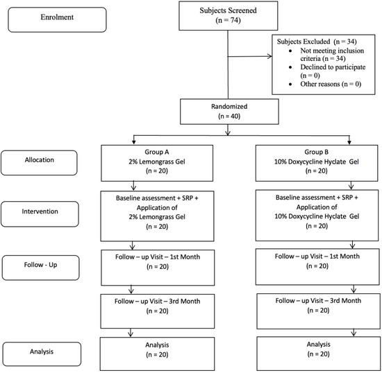Immediately after baseline assessment, all subjects received SRP therapy followed by application of local drug delivery. The investigator assigned for application of LDD gels applied 2% lemongrass gel and 10% doxycycline hyclate gel into periodontal pockets as per patient codes. The LDD gel was inserted into the bases of the pockets using a special syringe with a blunt cannula. The end of the blunt cannula was moved coronally to fill the pocket, and the excess gel was removed using a curette or wet cotton pellet. The site was covered with a periodontal dressing (Coe-Pak®) to prevent the medication from being flushed out of the pocket. All subjects were advised to use 0.2% of chlorhexidine rinses, and standard oral hygiene instructions were given. After one week, the subjects were reviewed for any discomfort such as transient discomfort, erythema, transient resistance, allergy following treatment, and visual examination to record any soft tissue changes after removal of periodontal dressing. The subjects were recalled for follow-up assessments on 1st and 3rd months, and oral hygiene maintenance was reinforced. The study design flow chart is given in Figure 2. All subjects who participated completed the study, and none of the subjects had any complications during recall visits.