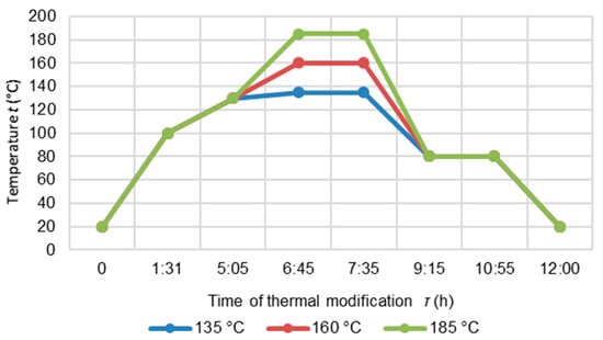 The thermal modification of wood consisted of the following three steps (Figure 1): high temperature drying (at 100 °C for 90 min and then the steadily increasing to 130 °C for 2.5 h); heat treatment at t = 135 °C, 160 °C and 185 °C for a 50 min period, cooling and moisture conditioning. The wood was cooled down in a controlled way so that its temperature reached 80 °C. At the end of the thermal modification, the kiln was turned off and the specimens were kept inside. The specimens were allowed to cool naturally until their temperature reached 20 °C.