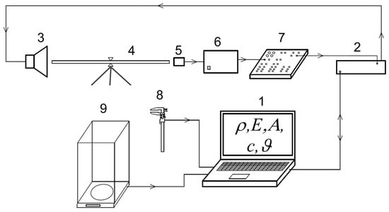 The device consists of a computer (1); generator of sinusoidal signal (in the range of acoustic frequencies) and response detector (2); exciter-loudspeaker (3); test specimen (4); electromagnetic detector (5); high-pass filter (6); preamplifier (7); digital gauger, Mitutoyo (8) and electronic scale (9). The fundamental resonance frequency fr, as well as frequencies f1 and f2, were determined. These were stored in the computer for further processing and evaluation using the computer software. The physical and acoustical characteristics (density ρ, modulus of elasticity along the grain EL, acoustic constant A, speed of sound cL and logarithmic damping decrement ϑ) were calculated according to the Equations (1)–(4).
