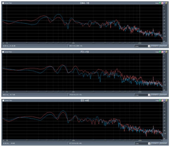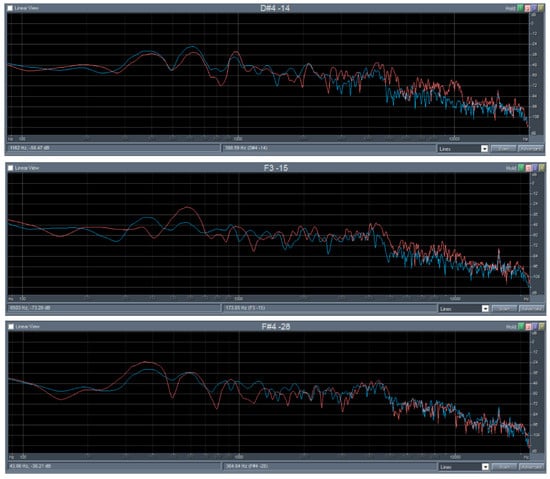 The results of the FFT analysis (time course of signal, sound spectrum) of the bars of spruce and maple wood before (blue curve) and after modification (red curve) are presented in Figure 4 and Figure 5. The mean ratios of aliquot frequencies in maple wood after thermal modification were as follows: 1:1.6:2.4 at 135 °C (1:1.7:2.6 before modification), 1:1.7:2.9 at 160 °C (1:1.8:2.8 before), 1:1.7:2.7 at 185 °C (1:1.6:2.6 before). Figure 4 shows that the fundamental resonant frequency of maple slightly increased after each modification and the sound pressure level reduced the thermal modification effect.