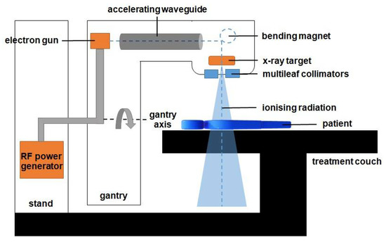 Cancer is one of the critical health issues worldwide [1]. Radiotherapy remains an important curative technique in cancer treatment. Approximately half of all cancer patients obtained radiotherapy as a part of their treatment regime [2]. The treatment may also be combined with other treatment modalities, which include chemotherapy or surgery [3,4,5]. Radiotherapy involves the delivery of a radiation dose to the tumour while limiting the dose to the surrounding healthy tissues during treatment. Typically, the radiation dose is delivered externally from a linear accelerator (linac) or internally in certain types of cancers, using radioactive sources. Figure 1 shows a schematic diagram of a linac that produces a highly focused ionising radiation in the patient.