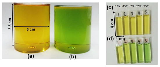 PRESAGE is a commercial radiochromic polymer dosimeter that was introduced by John Adamovics [71]. It exhibits several strong advantages compared to other polymer gel dosimeters; it is insensitive to oxygen contamination and can be fabricated with any desired shape without any vessels; it does not exhibit diffusion and has high stability and higher optical evaluation [19,20,35,72]. Moreover, the presence of oxygen can increase the dosimeter sensitivity upon fabrication [73]. It is also a tissue equivalent in the range of megavoltage energies, which is suitable for radiotherapy. Additionally, the dosimeter response to radiation is not dependent on the dose rate and a wide range of energy [20]. The colour change in PRESAGE upon irradiation is illustrated in Figure 2.