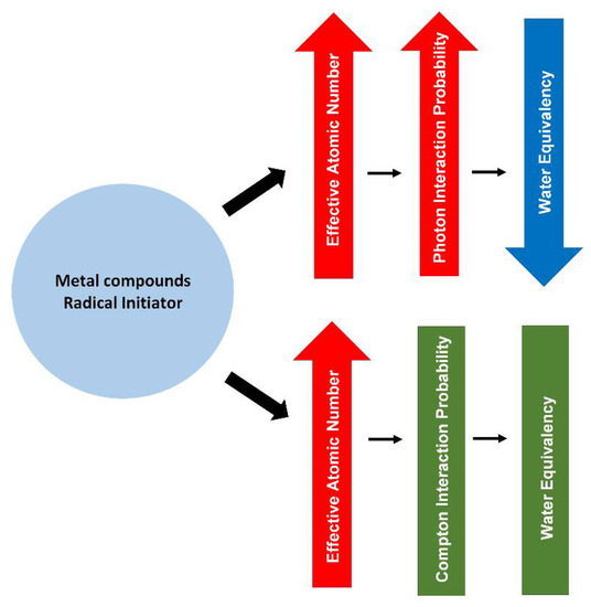 Among the halocarbons, iodoform demonstrated higher density (4.01 g/cm3) in comparison to the bromoform and chloroform, with the densities of 2.89 g/cm3 and 1.49 g/cm3, respectively. Nevertheless, PRESAGE that uses iodoform at 100 mM as a radical initiator shows a minor difference (<2.5%) in the Compton scattering cross-section, in comparison to water at the range of energy from 1 MeV to 20 MeV. Similarly, PRESAGE that employs iodoform shows a minor variation (<4%) for the pair production cross-section in comparison to water. In addition, due to the high atomic number of iodine (Z = 53), PRESAGE (iodoform 100 mM) has an effective atomic number of 16.03 [93]. This strongly indicates that the effective atomic number plays an insignificant role in water equivalency at megavoltage energies. However, PRESAGE (iodoform 100 mM) possesses a high deviation of more than 96% for photoelectric cross-section when compared with water. The most recent study, which used bromine-based RI PRESAGE, shows the small difference of 8% in the photoelectric absorption between the PRESAGE and water. This is due to the small fractional weight of Br in the composition. Increasing the proportion of Br has increased the percentage difference by more than 50%, due to the increment of the effective atomic number [94]. Figure 4 shows a simple diagram that summarises the effects of the metal compounds and the radical initiator on the radiological properties of PRESAGE.