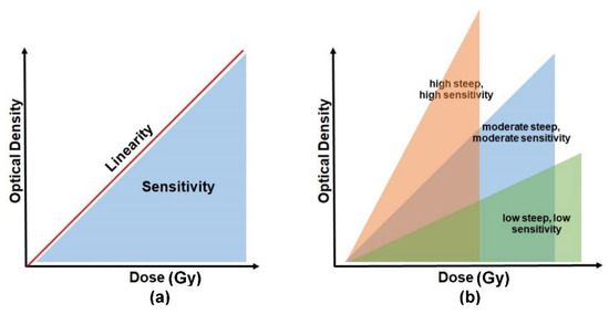 The absorbed radiation dose causes the irradiated PRESAGE to change its colour. The dosimeters become darker as the absorbed dose increases. The intensity of the changes is read out in terms of optical density. The absorbed dose is directly proportional to the optical density, and the relationship between the two parameters can be indicated as dose linearity, as shown in Figure 5a. A good dosimeter should be capable of demonstrating dose linearity. The dose sensitivity of PRESAGE, on the other hand, can be illustrated by the slope of the optical density vs. the dose absorbed, as shown in Figure 5b. The steeper slope of the curve indicates a higher sensitivity of the detector to radiation. PRESAGE will exhibit different sensitivity characteristics based on the effective atomic number and the weight fraction of the leuco-dye, the free radical initiator (halocarbons), and the catalyst.