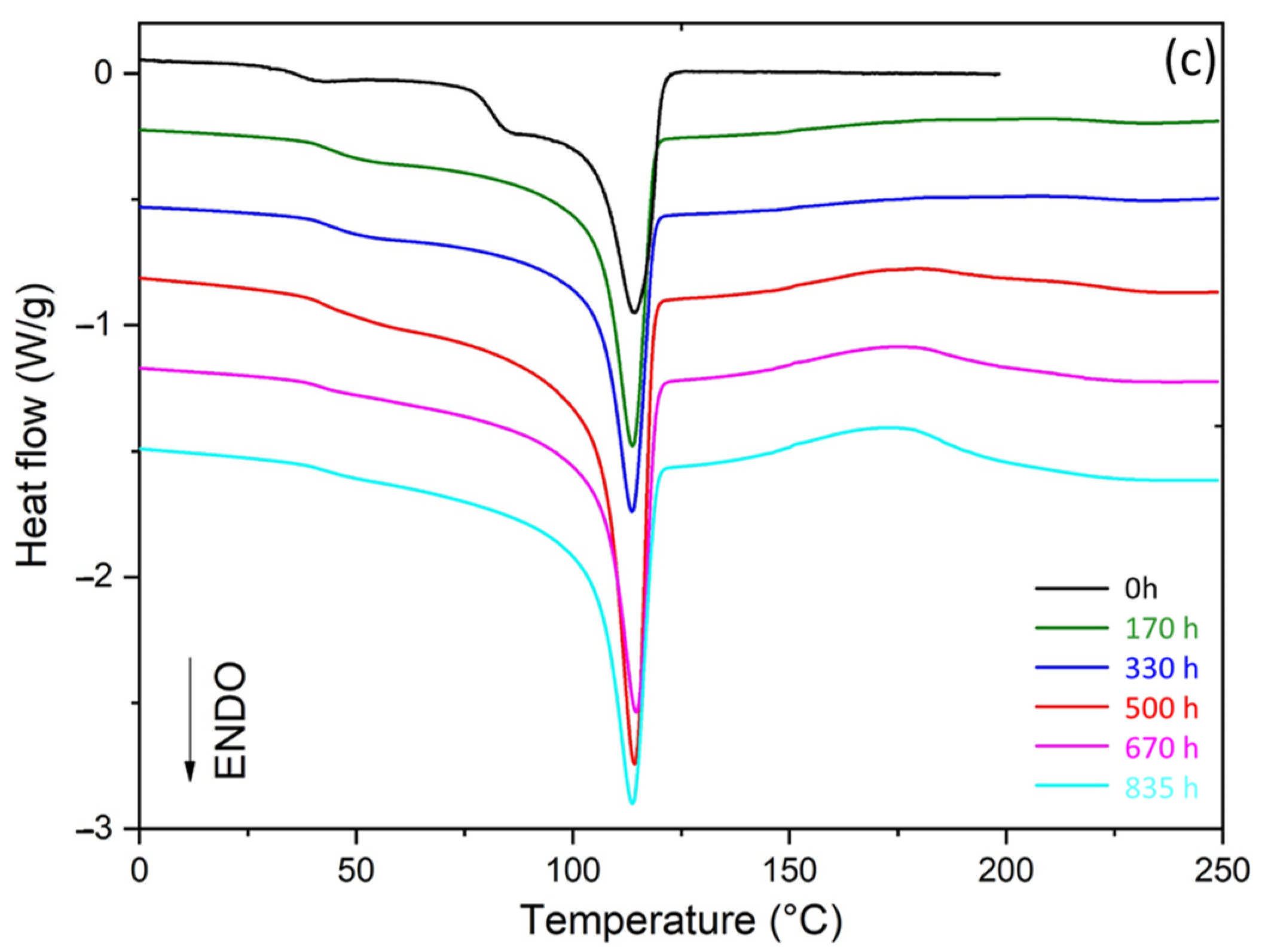 - Finally, the sample is again heated up to a temperature above its melting point (250 °C) with a rate of 10 °C·min−1. This last temperature ramp reveals the structural changes caused by the different annealing treatments performed on the sample, i.e., the splitting of the initial broad melting peak into a series of elementary melting peaks, as presented in Figure 1.