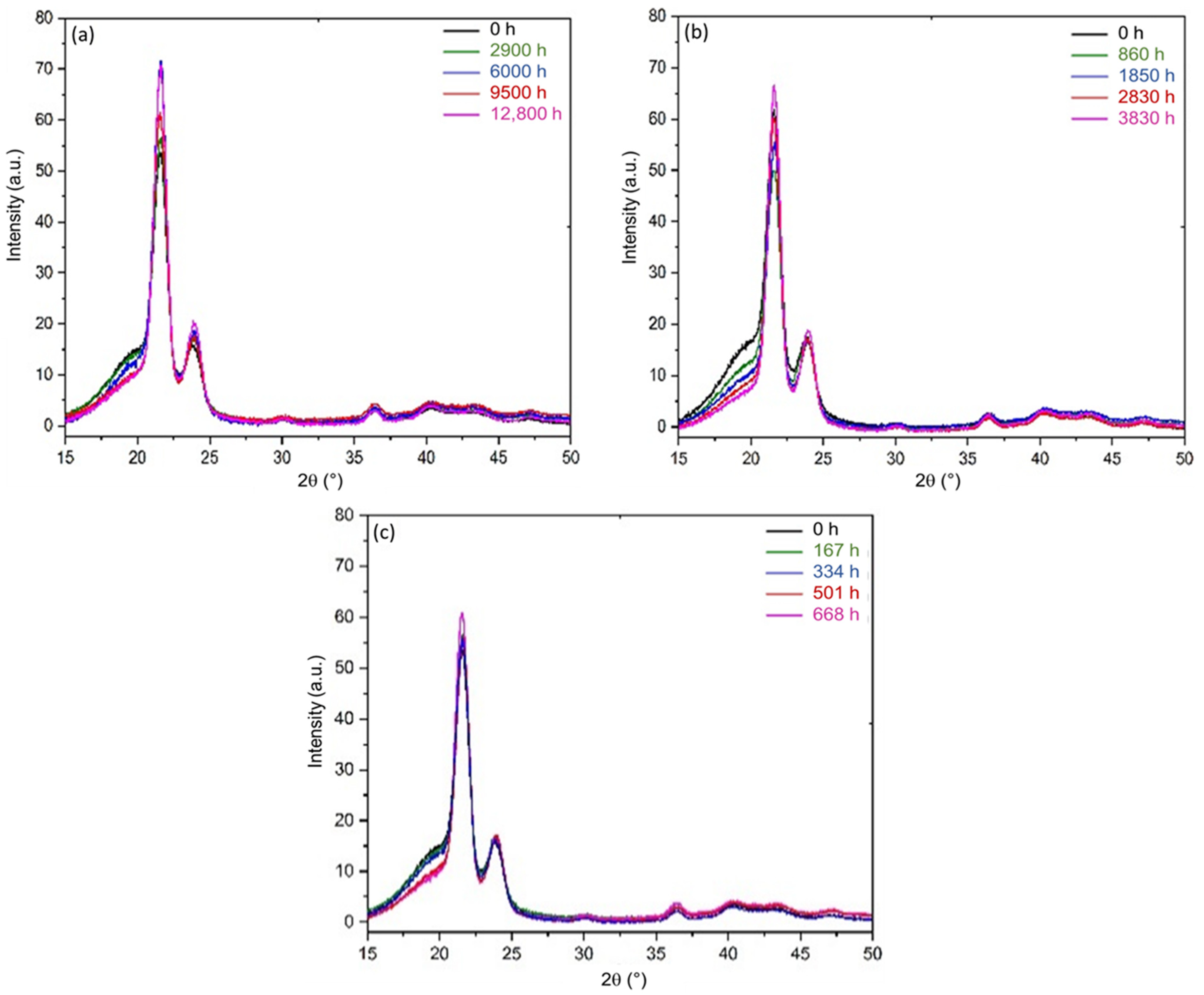 - Huang, Z.; Li, Y.; Ren, X. Comparing cracking time ans structure changes of different high-density polyethylenes during stress and photo-oxidative aging. J. Appl. Polym. Sci. 2014, 131, 40904. [Google Scholar] [CrossRef]