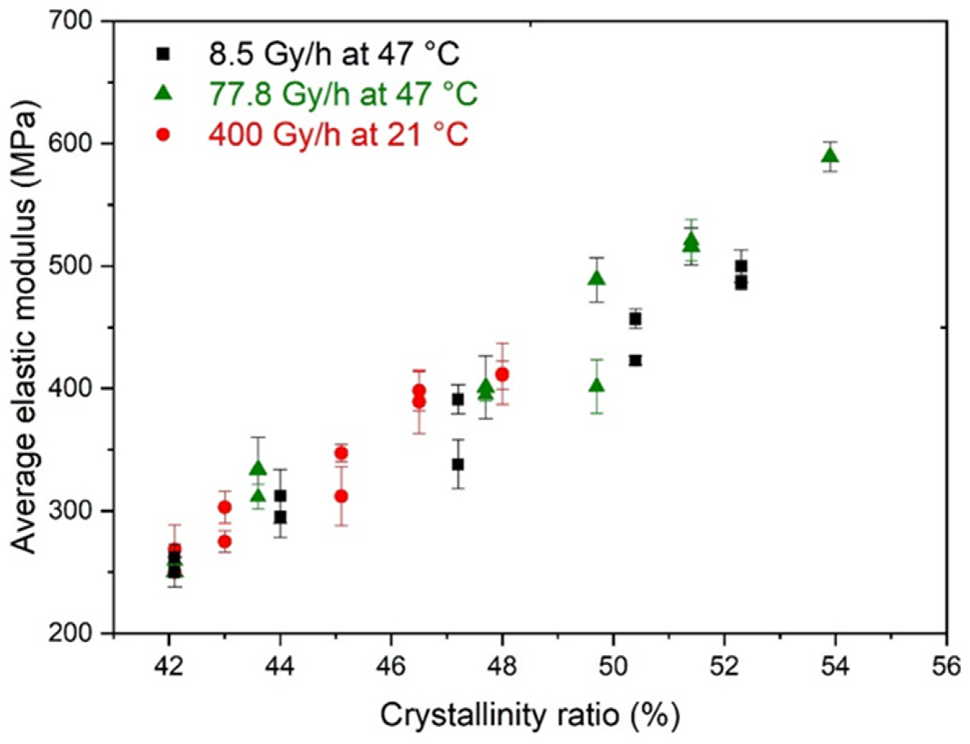 - Colin, X.; Monchy-Leroy, C.; Verdu, J. Effect of gamma irradiation on tensile properties of low molecular weight polyethylene samples. Radiat. Phys. Chem. 2011, 80, 895–901. [Google Scholar] [CrossRef][Green Version]