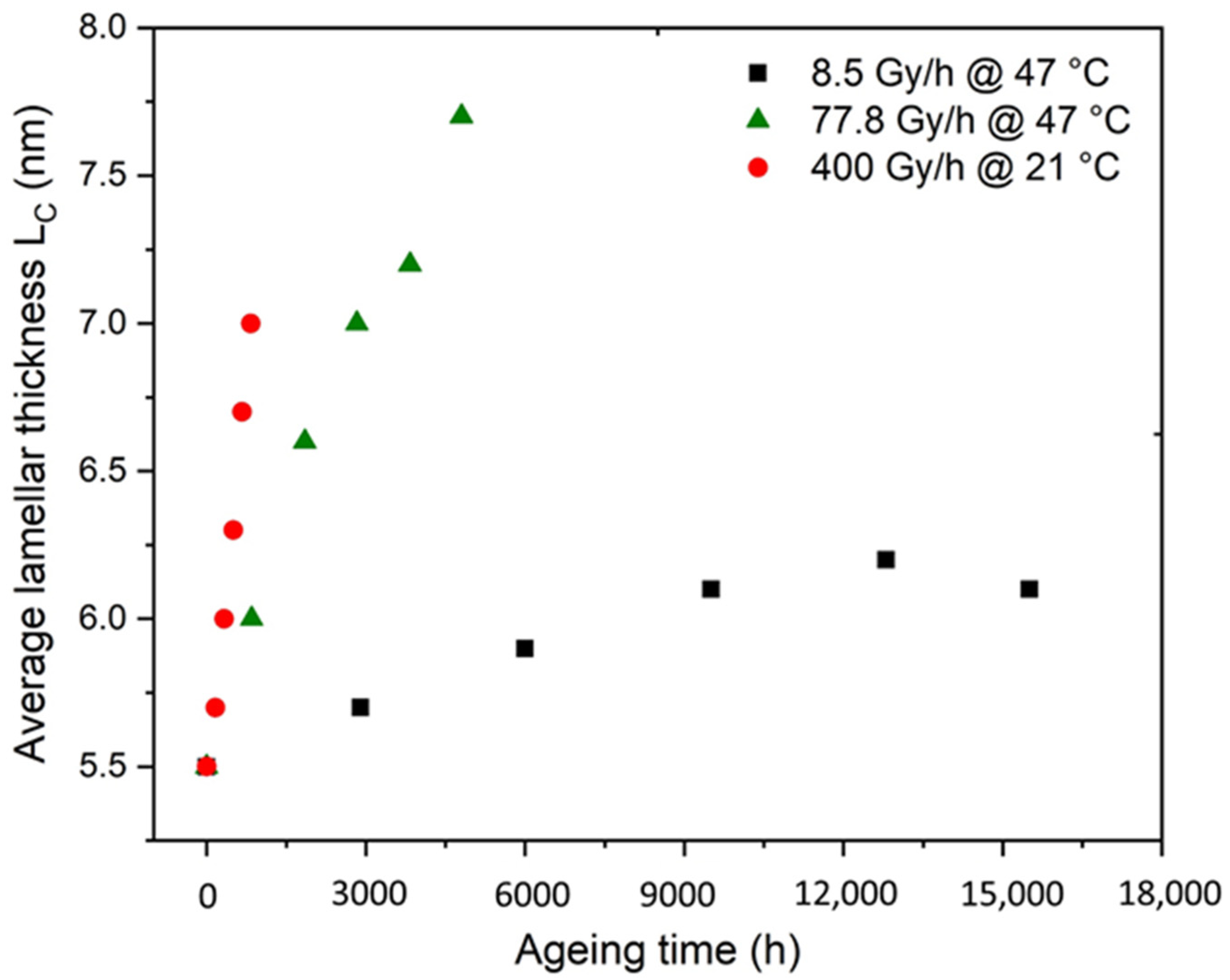 - Colin, X.; Monchy-Leroy, C.; Audouin, L.; Verdu, J. Lifetime prediction of polyethylene in nuclear plants. Nucl. Instrum. Methods Phys. Res. 2007, B265, 251–255. [Google Scholar] [CrossRef]
