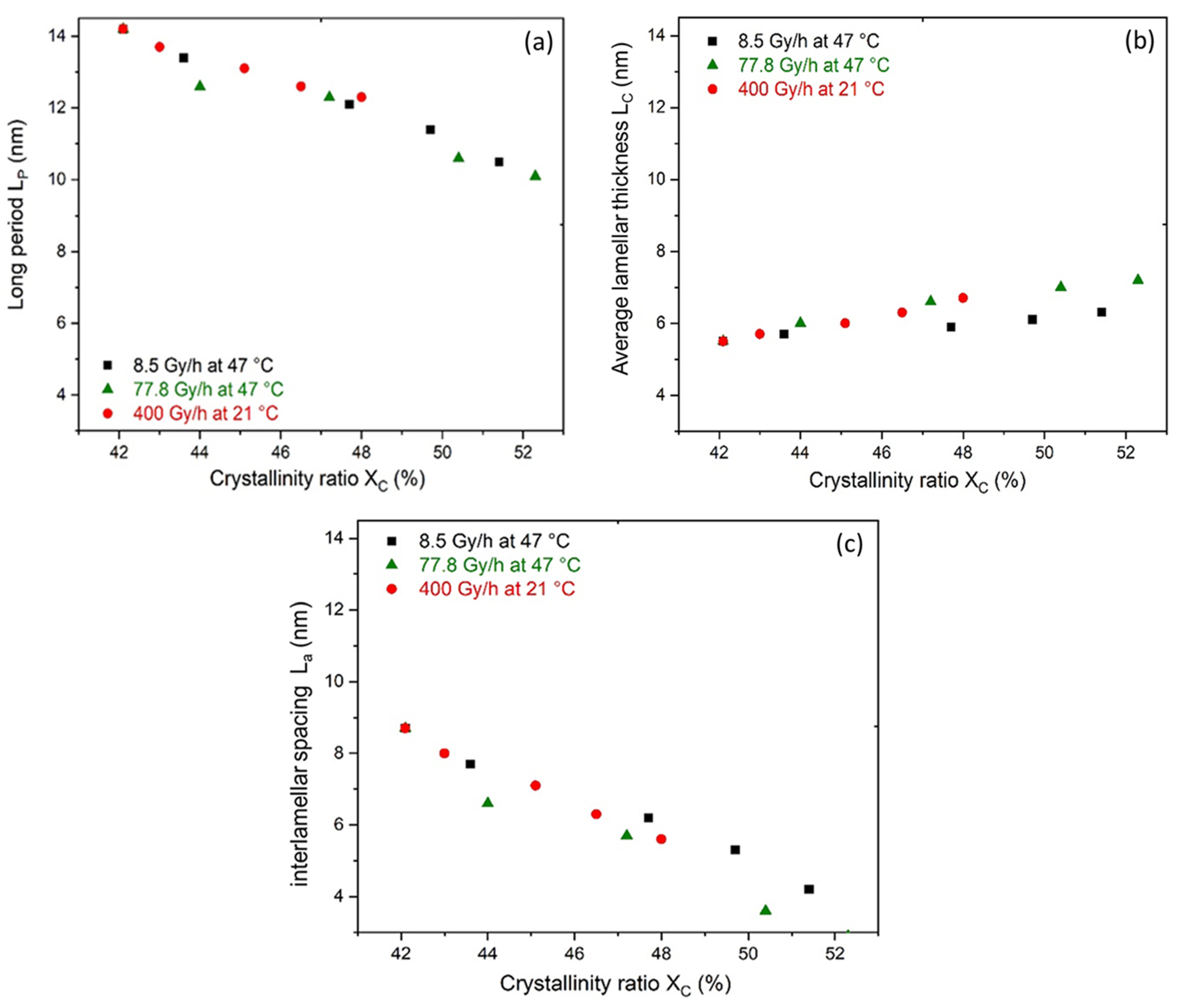 3.2. Changes in LC, LP, and La during the Radiothermal Ageing