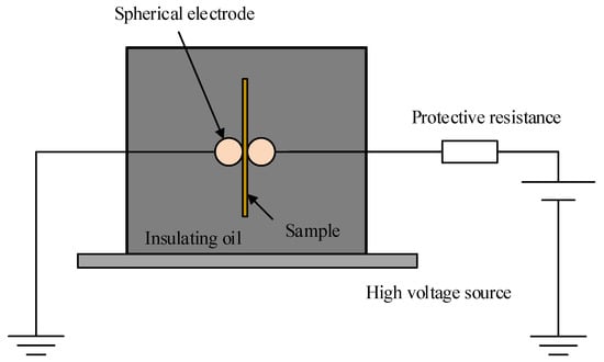 According to national standard GB/T 1408.1-2006, the relationship between the tensile stress and the insulation properties of the material was investigated by subjecting four groups of polyethylene specimens with different elongation ratios to a frequency AC breakdown test. The experimental electrode is a spherical electrode with a diameter of 25 mm, and the polyethylene breakdown experimental setup is shown in Figure 1 [20,21]. The voltage is increased to 15 kV and then the voltage is increased at a constant rate until the sample breaks down. Two parameter Weibull distribution was used to record the data of 10 breakdown experiments of each group of samples. The characteristic breakdown field strength of the material was expressed as the breakdown field strength corresponding to a cumulative failure probability of 63.2% [22,23].