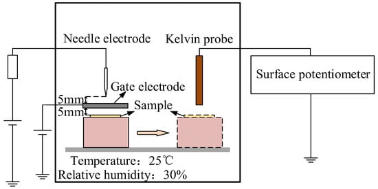 Charging of polyethylene surfaces was with the needle-gate electrodes. The needle electrode is ramped up to 5 kV and the gate electrode is ramped up to 2.5 kV at a constant rate and charged for 20 min during the test. After charging, turn off the power immediately and move the specimen to the Kelvin probe below quickly, the change pattern of the material surface potential is recorded by the electrostatic meter and the probe is aligned with the charging position during the recording process [26]. The external environmental factors were kept with the relative humidity of 30% and the constant temperature of 25 °C.