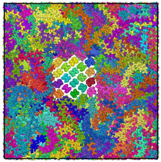 The polyethylene model with mixed crystalline and amorphous regions was built from the view of microscopic or submicroscopic. Preliminary model was with 4 × 4 × 80 crystalline and 80 irregular molecular chains of 100-monomer, and the initial amorphous model density is set to 0.8 g/cm3 [27,28]. In the simulation, it was subjected to 0.5 × 104 fs of constant pressure relaxation under a regular system synthesis (NVT) with reaction conditions set to 500 K with the time step of 0.5 fs, followed by 0.5 × 104 fs of constant pressure relaxation under an isothermal isobaric system synthesis (NPT) with reaction conditions set to 500 K with the time step of 0.5 fs. The microscopic model of the polyethylene equilibrium state is shown in Figure 4. The semi-crystalline polyethylene system was then subjected to uniaxial stretching simulations at a constant rate with a zero-pressure condition for the two lateral simulation cell faces. The semi-crystalline polyethylene configurations were uniaxially deformed at a strain rate of 107 s−1.