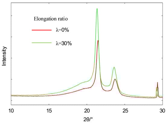 Figure 5 shows the X-ray diffractograms of polyethylene at different stretching ratios. The polyethylene has high diffraction intensity (110) crystalline diffraction peaks and (200) crystalline diffraction peaks near 21.35° and 23.60°. The crystallinity of the measured samples was measured by fitting the curves in the obtained spectra to the split peaks using the Gauss-Cauchy method and calculating the integration of the fitted curves. The calculation formula is shown in Equation (1) [29].