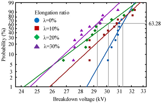 Figure 6 shows the AC breakdown voltage distribution of polyethylene at different elongation ratio. The breakdown voltages of the four samples at 63.28% breakdown probability are 31.25 kV, 30.59 kV, 30.22 kV and 29.18 kV. Table 2 shows the Weibull parameters for the breakdown voltage of polyethylene at different elongation ratios. The decrease in the shape parameter indicates a greater dispersion of the breakdown test results [31]. In this paper, the breakdown field dispersion of original polyethylene is the largest and the breakdown voltage is the highest because of its most uniform internal structure. The degree of defects in different places inside the stretched polyethylene leads to the generation of electrical dendrites that accelerate insulation failure [32]. This phenomenon leads to a decrease in shape parameters and breakdown voltage.