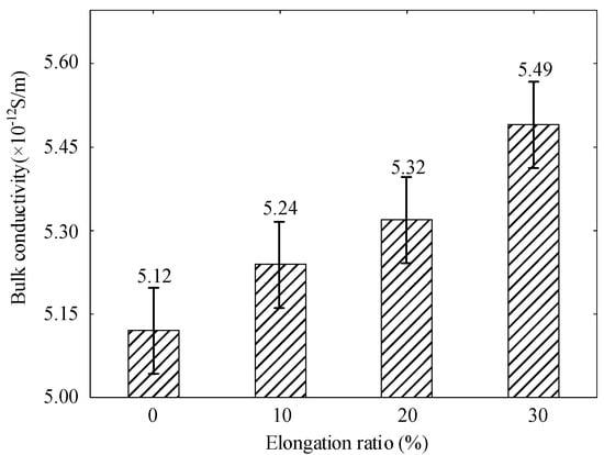 Figure 7 shows the electrical conductivity of polyethylene at different elongation ratios. According to the theory of free volume, there is some free volume between the crystalline and amorphous regions of polyethylene and the free volume increases under the action of stretching. The migration rate of carriers under the action of electric field increases [33]. The conductivity of polyethylene gradually increases as the elongation ratio increases. The tensile stress on the specimen also becomes larger when the elongation ratio increases. Some amorphous zones are not converted to crystalline zones in time. Accompanied by slippage between the tensile grains of the specimen to result an increase in the proportion of amorphous regions and the release of part of the carriers by traps [34]. As the stretching process increases, the crystallinity decreases with the free volume in-creasing inside the polyethylene, According to the free volume theory, the increased free volume results to an increase in carrier mobility [35].