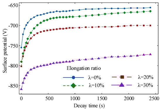 Decay characteristics of polyethylene surface potential at different elongation ratios.