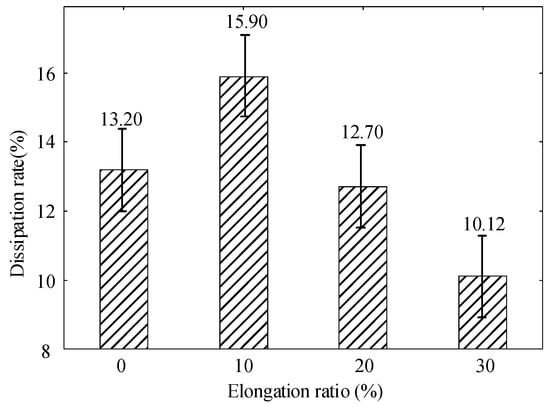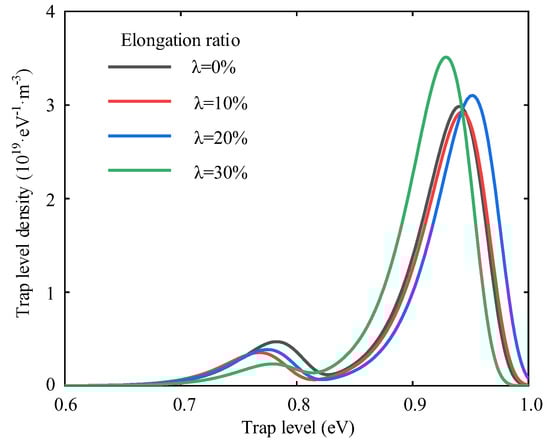 When the polyethylene is subject to tensile stress, the interface between the crystalline and amorphous zones is destroyed, which leads to the differences of trap distribution [37]. The trap energy level distribution of polyethylene at different elongation ratios is shown in Figure 10. Negative ions and electrons are stacked inside the specimen. The variation pattern of the trap energy level shows a trend of decreasing and then increasing with the increasing elongation ratio. When the polyethylene elongation ratio is 10%, the internal molecular chains of polymers are subject to stresses that cause orientation and untwisting movements and the distance between molecular chains will increase. This increase will facilitate the migration of ions and electrons in the molecular chain. The trap depth of the specimen becomes shallow and the surface potential decay rate becomes large [38]. The untwisting and orientation between the molecular chains contribute to the decay of the surface potential when the stretching is relatively small. The distance between the molecular chains increases further and even causes the molecular chains to break when the polyethylene elongation ratio increases to 30%. The broken molecular chains create new traps that limit the movement of charges. This results in charge accumulation and a decrease in the decay rate of the surface potential, which can reduce the insulation properties of polyethylene.