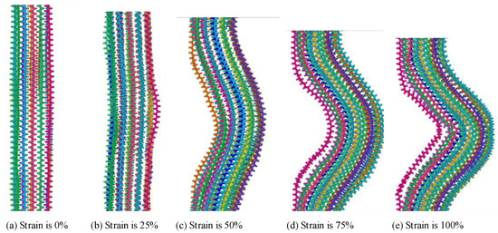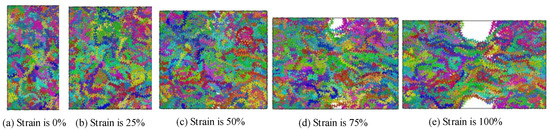 The polyethylene model is made up of a mixture of crystalline and amorphous zones. A periodic boundary condition is employed in this paper. A semi-wafer lamination model was prepared to study the tensile process [39]. The structural changes of polyethylene during the tensile process are shown in Figure 11 and Figure 12. During the tensile process, the deformation of the amorphous region of polyethylene will occur under the action of the force. The untwisting and orientation of the chains leads to the formation of small cavities which can extend through the middle of the system and eventually lead to large cracks or even fracture of the whole system [40], thus affecting the properties of polyethylene. The essence of the deformation of the amorphous region is the mutual restriction and coordination of the entanglement morphology changes at different scales.